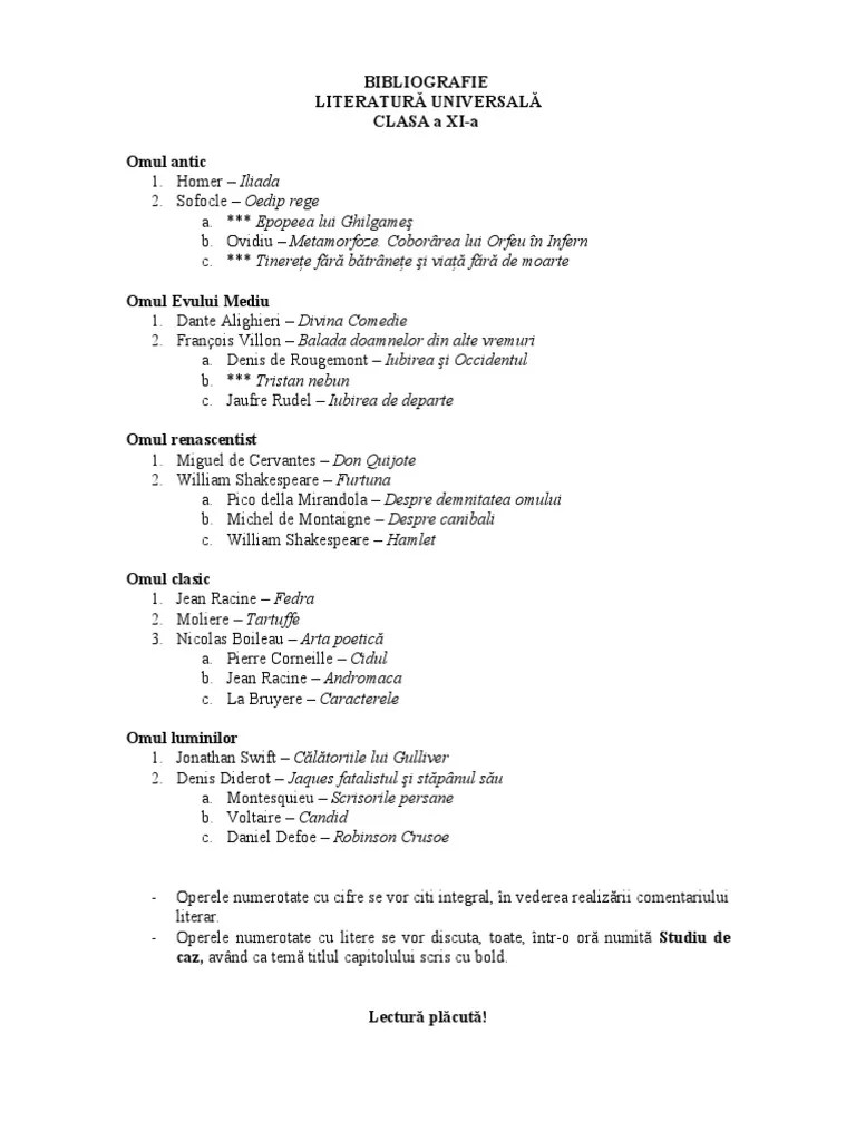 Literatura Universala Clasa 11 Programa Excelent. Vezi in programa exemple de ore la clasa, ce inseamna metoda cadranelor, scenarii didactice, exemple de fise de lucru, activitati pe grupe, jocuri de roluri. Gama completa de manuale scolare manualul scolar este, fara indoiala, cel mai important instrument de predare. Frumoasa literatură cehă literatura cehă are propriul univers fascinant care are darul să te poarte pe culmi interesante, prin naturalețea si frumusețea specifică. Nov 14, 2021 · create your thread, post your opinion, discuss with other member Capitole, subcapitole, grupuri de lectii etc.